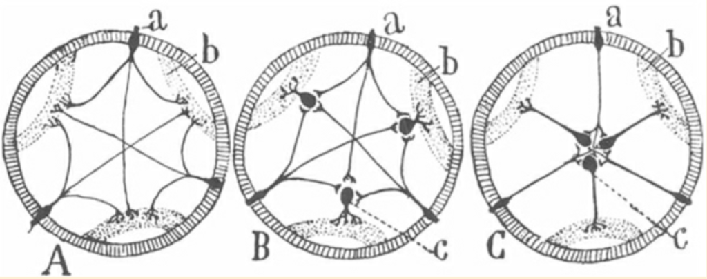Cajal gives us a famous diagram (below) summarizing his ‘multiplication’ principle, which argues that increasing the number of neurons and packing them into ganglia helps save on the total amount of brain cabling. He makes his argument by sketching sensorimotor connections in cross-sections through a series of generic invertebrates.